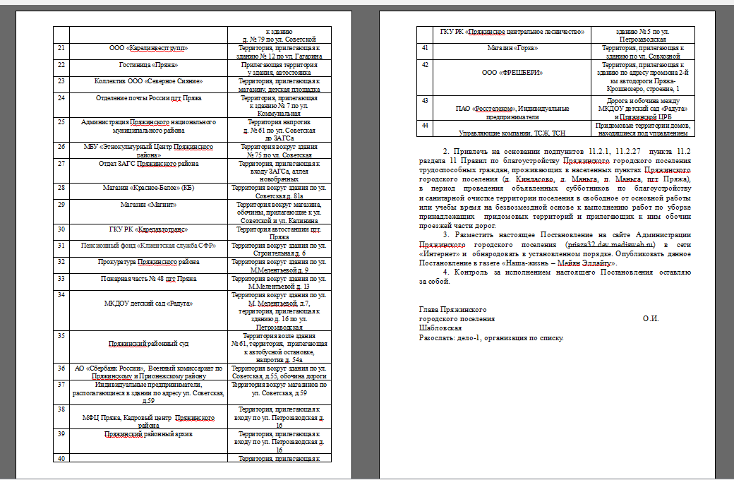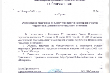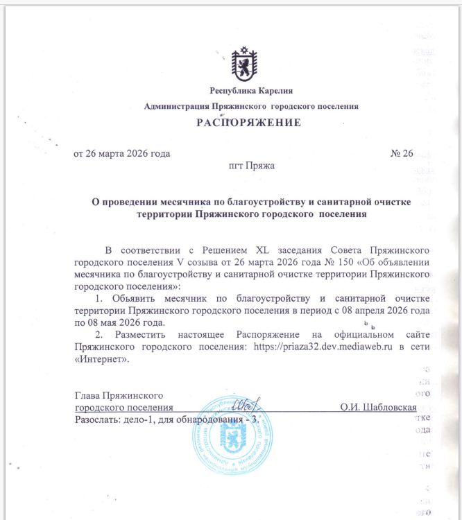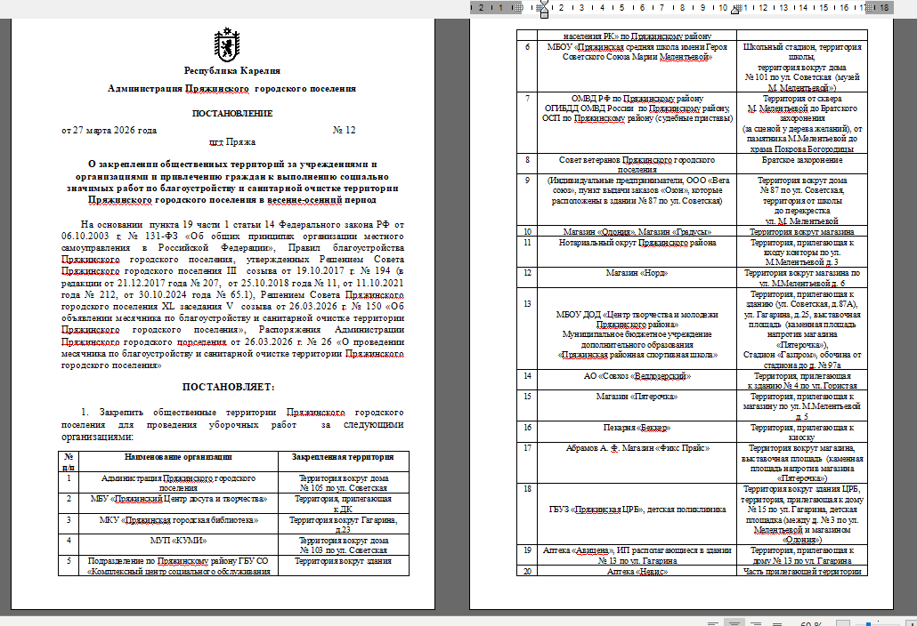 ПОСТАНОВЛЕНИЕ № 12 от 27 марта 2026 года "О закреплении общественных территорий за учреждениями и организациями и привлечению граждан к выполнению социально значимых работ по благоустройству и санитарной очистке территории Пряжинского городского поселения в весенне-осенний период"